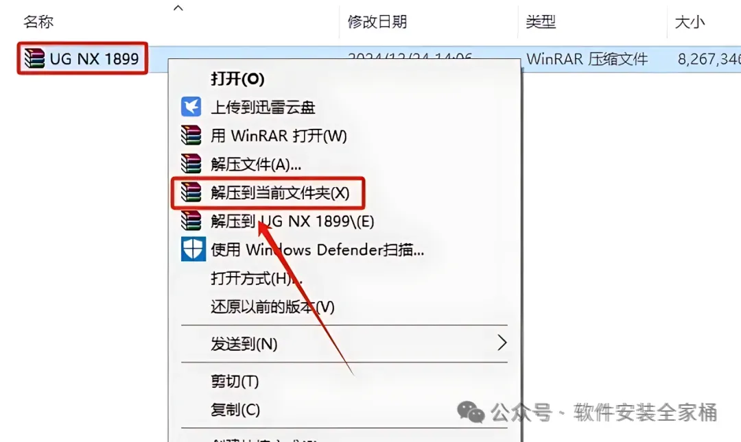 1.打开下载的UG 1899安装包,鼠标右击压缩包,选择【解压到当前文件夹】。