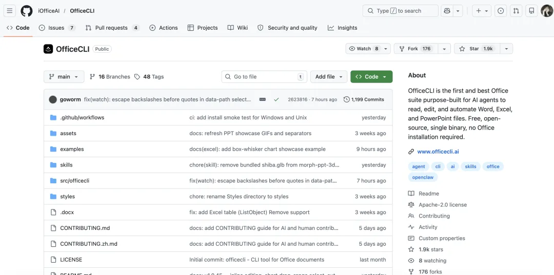 作为一款开源项目,OfficeCLI 的潜力巨大,随着 AI Agent 的普及,它必将成为 AI 办公领域的标配工具。如果你正在做 AI 产品或办公自动化,强烈建议上手体验,它会彻底改变你对 AI 办公的认知。
