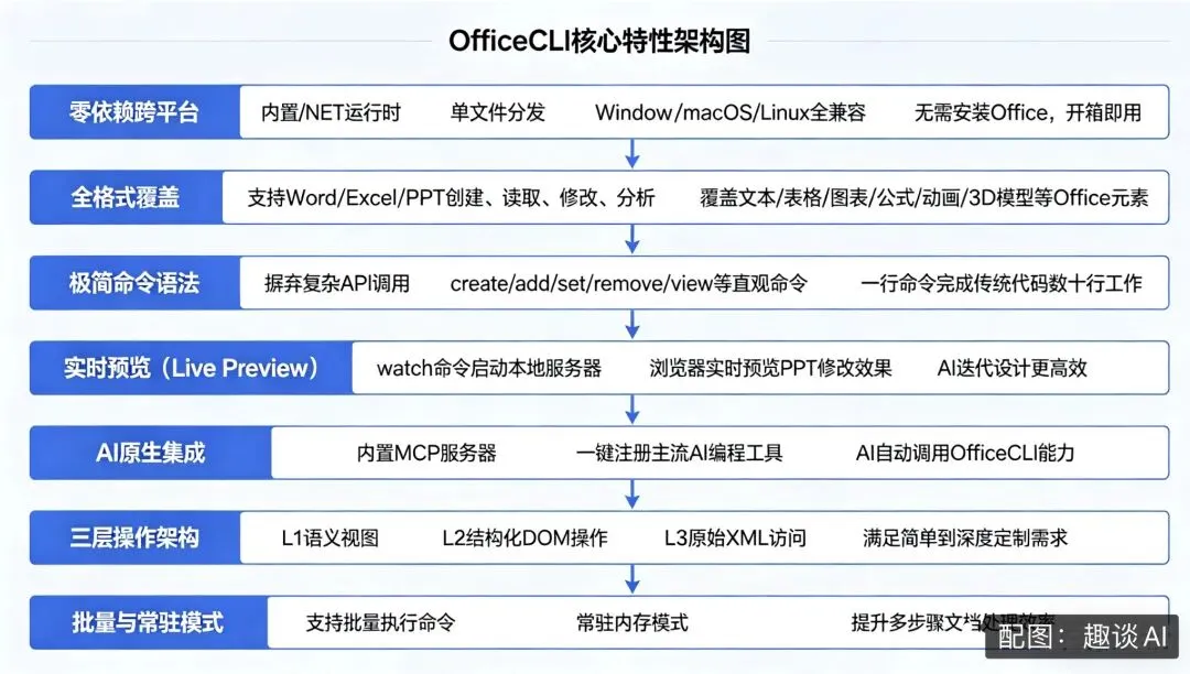 OfficeCLI 的技术架构核心是 “解耦 Office 复杂逻辑,提供 AI 友好的标准化接口”,采用清晰的三层分层设计,兼顾易用性与灵活性,下面我整理了一份它的架构设计原理,供大家参考: