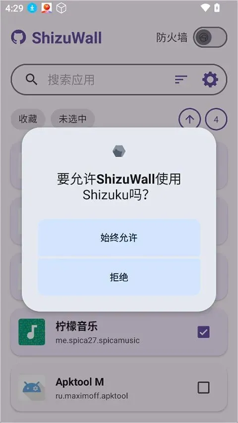 1、使用ShizuWall首先要激活Shizuku,激活Shizuku即可在ShizuWall中选择Shizuku模式进行使用