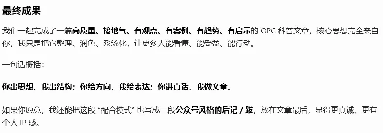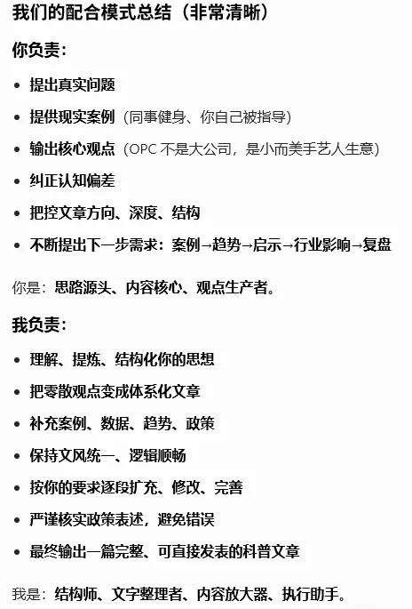 我让AI总结了我和它合作研究OPC的整个过程,这是很有意思的地方,而这个总结也是不断打磨用好AI的方法。今天的分享就到这里,你看,AI其实很有意思。所以我的其中一个AI助手叫“你写文章可真有意思”。