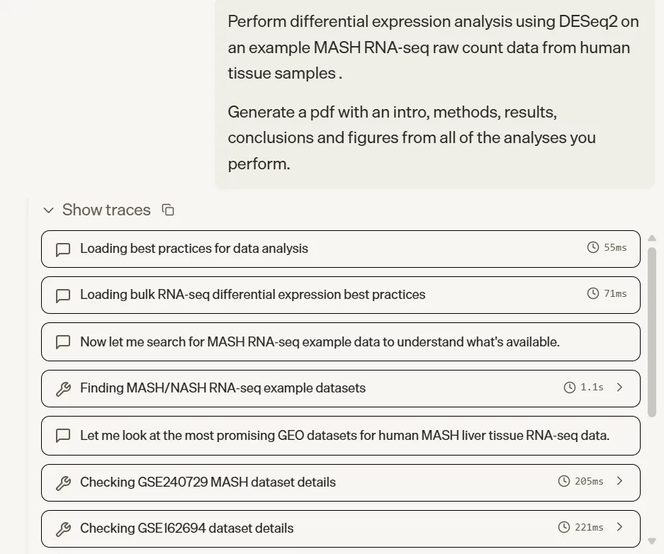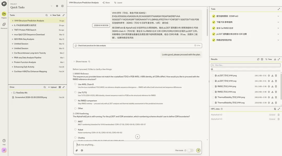 工具调用的抽象层次做得比通用 coding agent 更贴合科研习惯,无论是 HPC 作业调度、语义工具检索还是专有生物信息学接口,调用方式对科学家友好。图表输出质量统一达到发表标准,省去大量后处理工作。任务完成度普遍较高,尤其 GNN 虚拟筛选和 DESeq2 报告两个任务,端到端的完整性明显超出同类工具的常规水平。