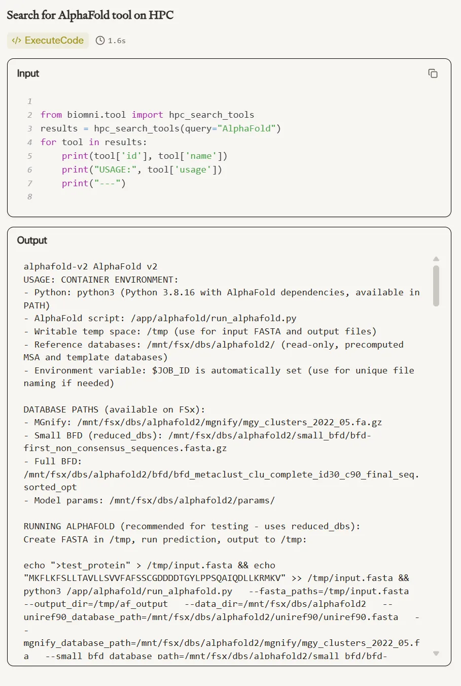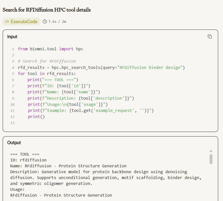 工具检索接口抽象合理,科研人员可以通过语义查询发现平台支持的分析能力,而不必记忆固定 API 名称。