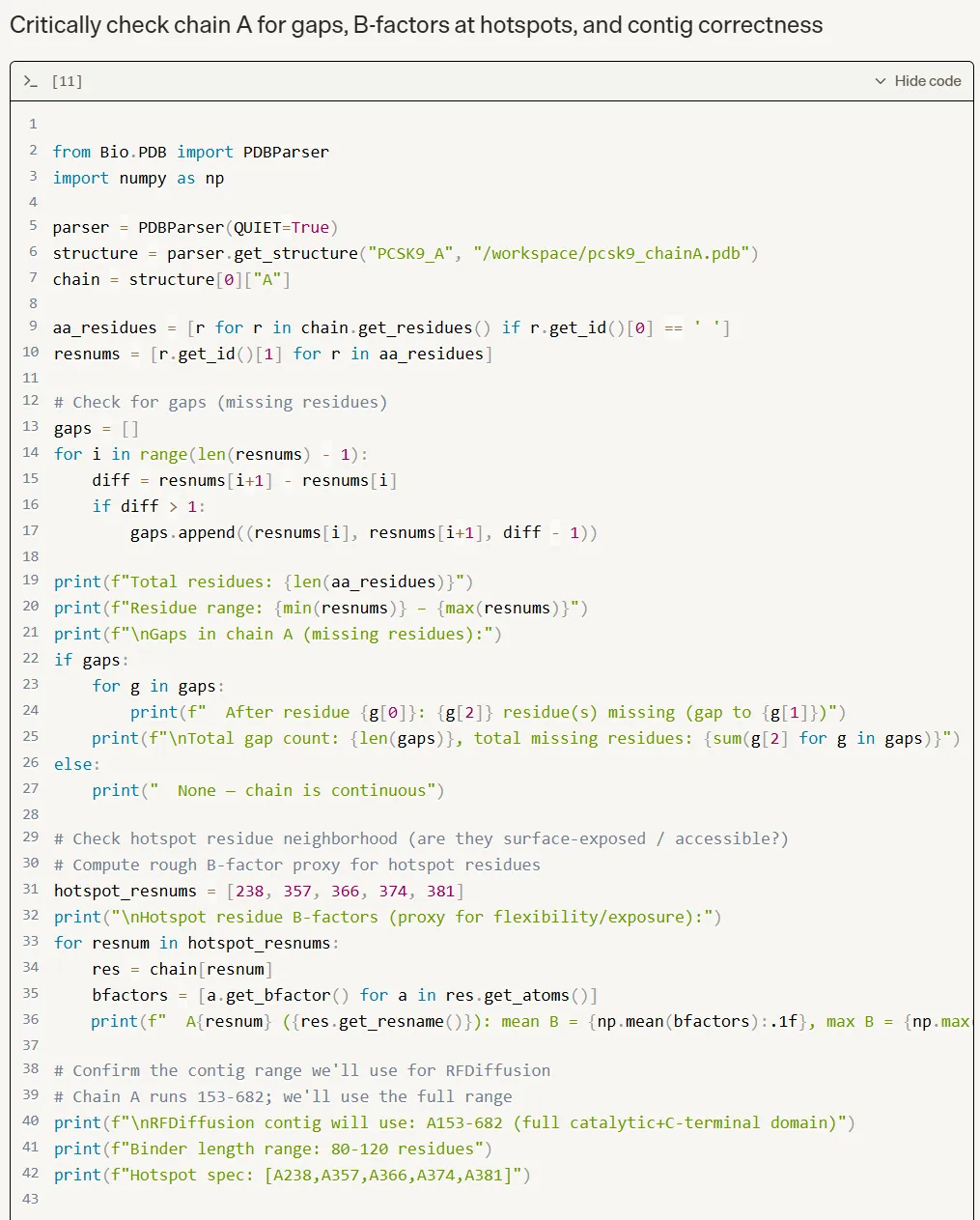 整个 PDB 预处理逻辑写得相当严谨——用 Biopython 精确过滤备用构象(altloc != A),并对热点残基逐一做 B-factor 检查以评估表面暴露程度。