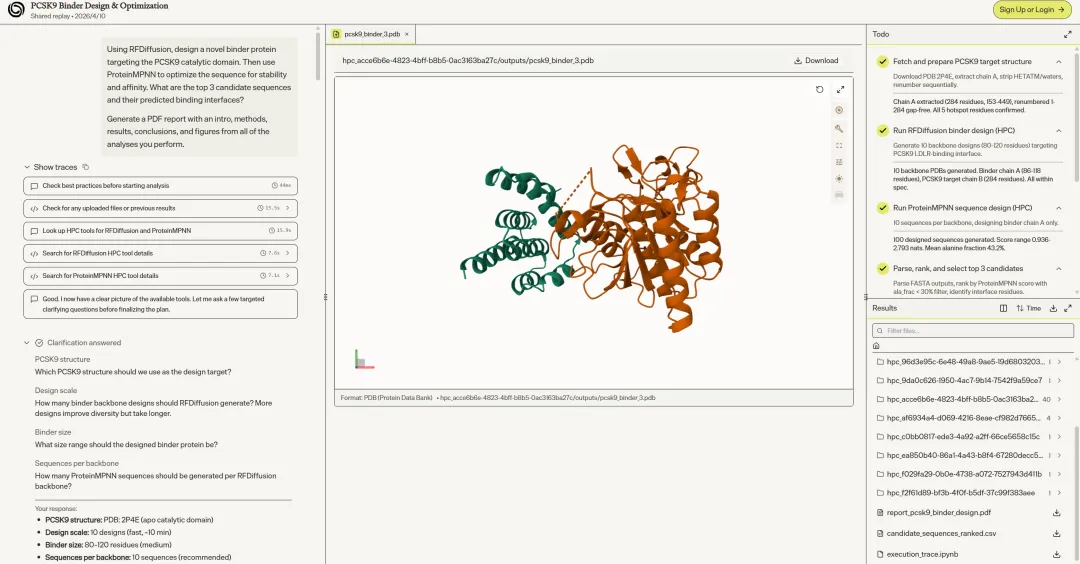 调用双工具链:先用 hpc.hpc_search_tools() 检索 RFDiffusion 和 ProteinMPNN 的参数规格,再下载 PDB 2P4E,提取 Chain A,验证 PCSK9 的五个热点残基(D238、R357、E366、D374、S381),排查 HETATM 记录和链间隙,最后生成适配 RFDiffusion 的 contig 配置。