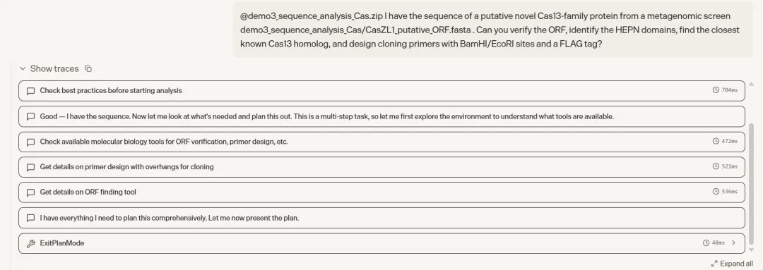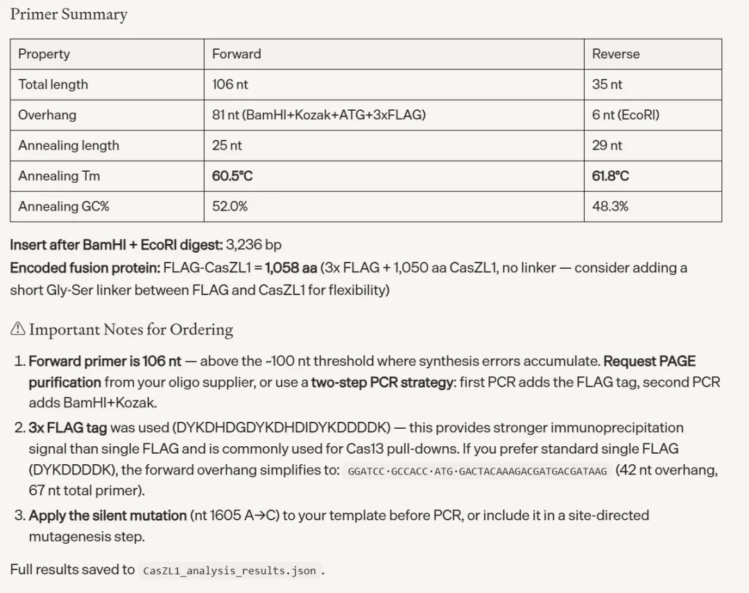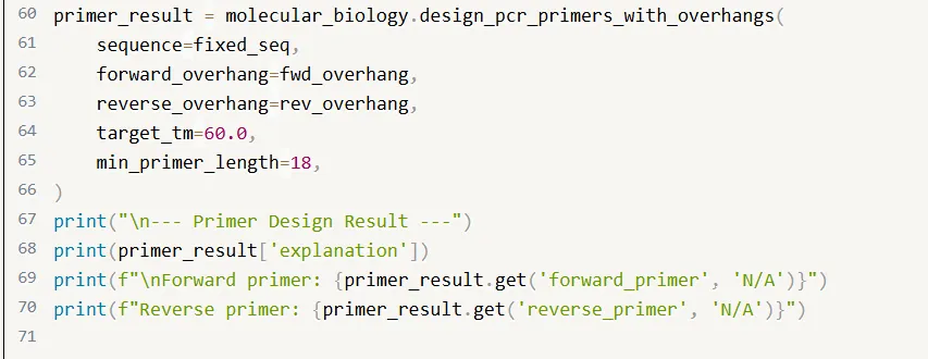 molecular_biology.design_pcr_primers_with_overhangs()工具接口将实验设计意图直接映射为函数参数,对湿实验科学家友好。