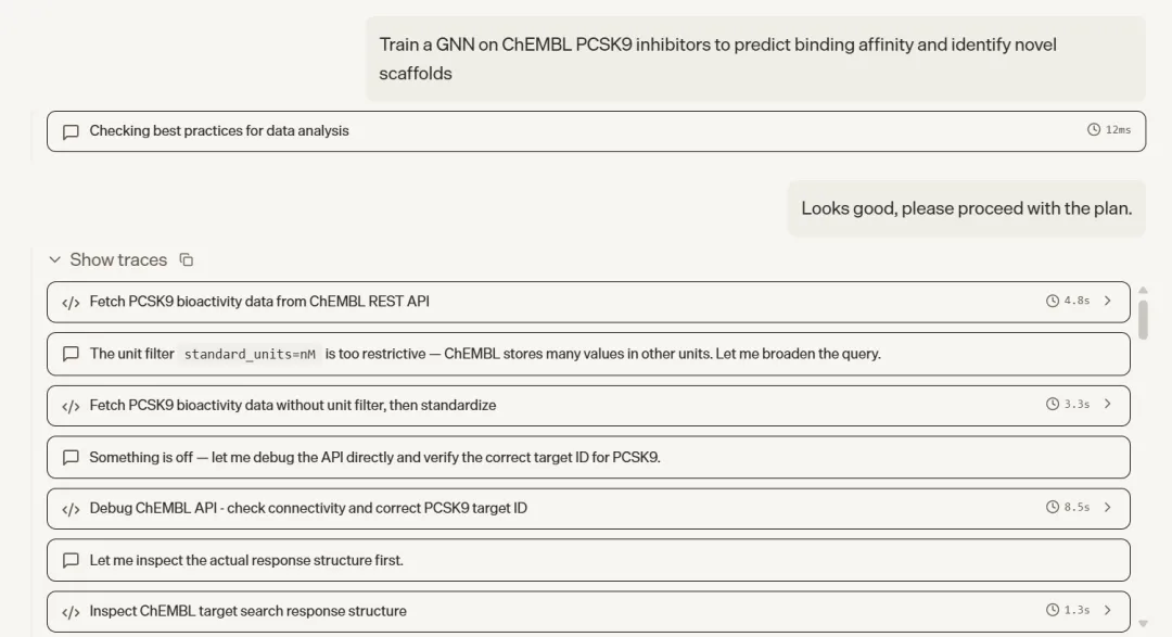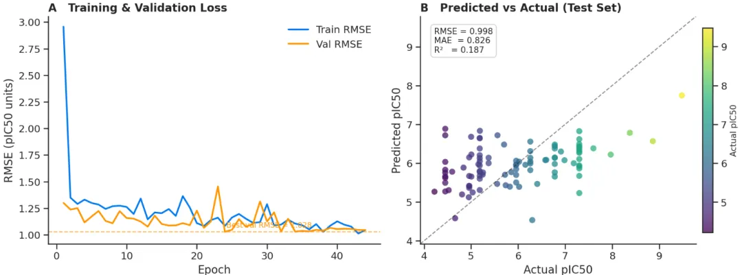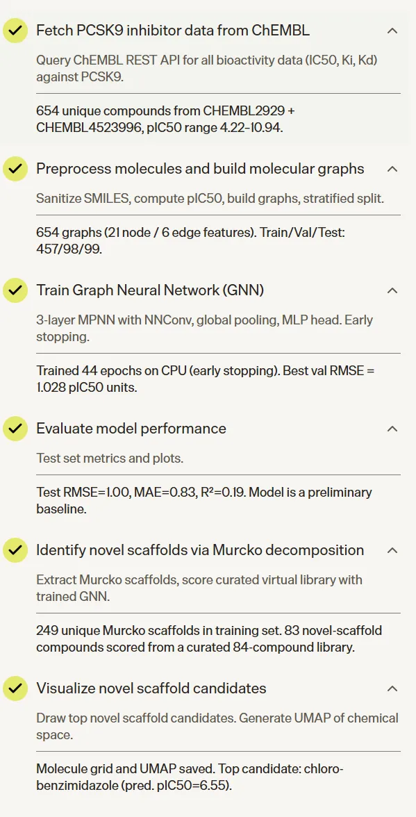 这是五个任务里流程最完整、技术深度最高的一个。Agent 从零搭建了一条端到端的 AI 药物发现 pipeline:从 ChEMBL 批量获取 PCSK9 的 IC50、Ki、Kd 数据,经过单位标准化、关系过滤(只保留精确测量值)、数据质量标记清洗、RDKit SMILES 验证、按 pIC50 四分位数分层划分训练/验证/测试集,再将每个分子转换为带 21 维原子特征和 6 维键特征的分子图,训练一个带边特征的 MPNN 模型,加入 BatchNorm、Dropout、梯度裁剪和早停机制,最终在测试集上输出 RMSE、MAE、R² 指标及预测散点图。