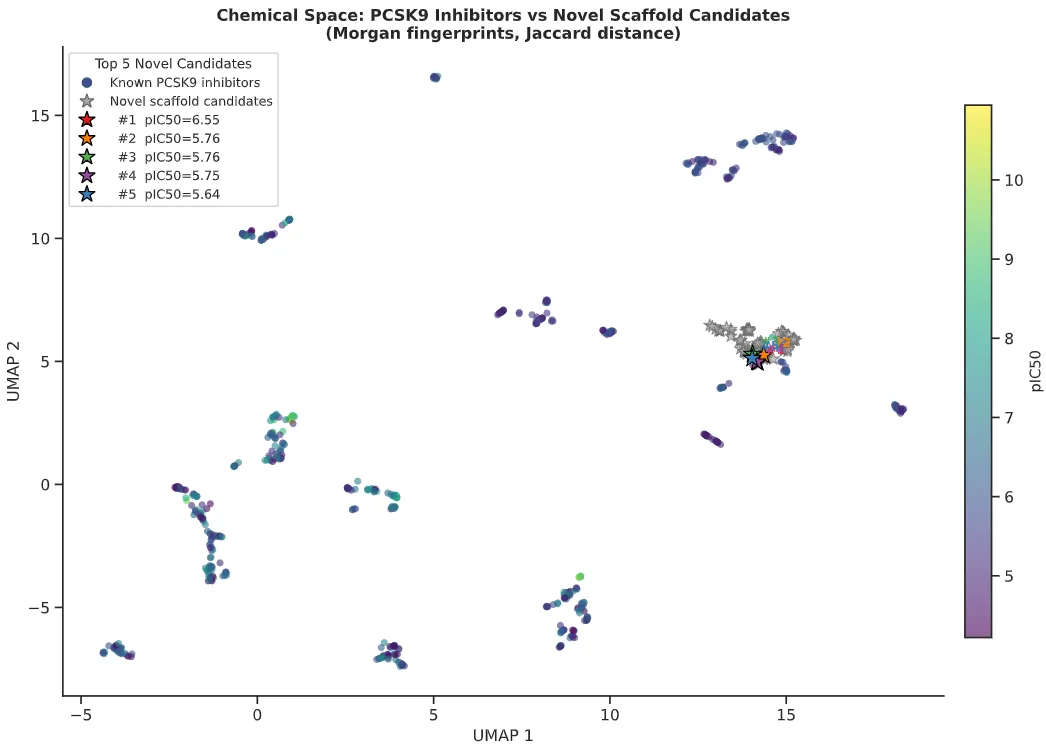 模型训练完成后,Agent 并未停在评估环节,而是继续提取训练集 Murcko scaffold,构建一批药物样小分子虚拟库,过滤掉与训练集重叠的骨架,用训练好的 GNN 对新骨架候选分子打分排序,最后计算 Morgan 指纹并用 UMAP 将已知 PCSK9 抑制剂和新骨架候选分子投影到同一化学空间,高亮 Top 5 候选。