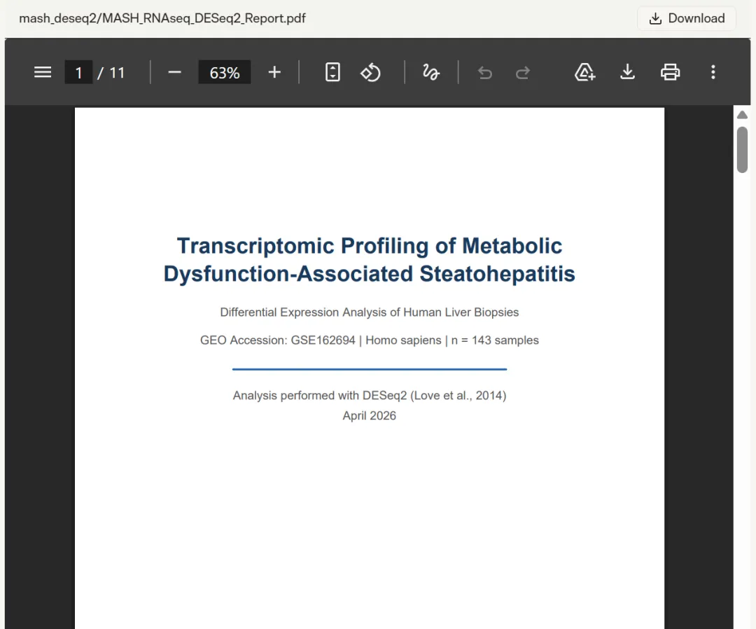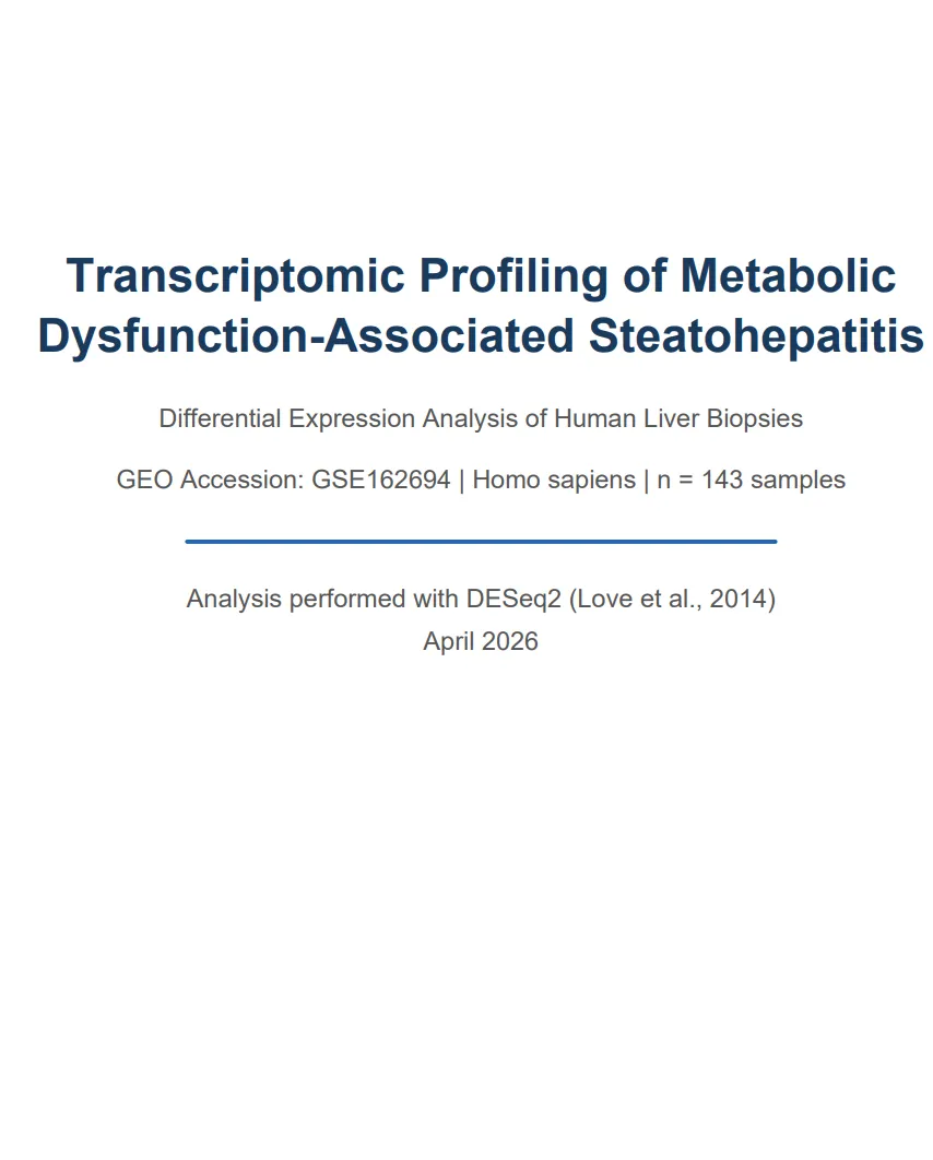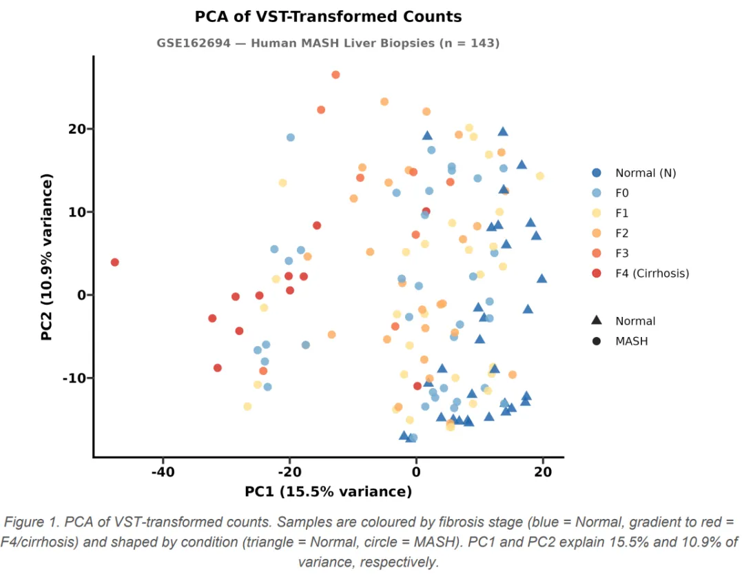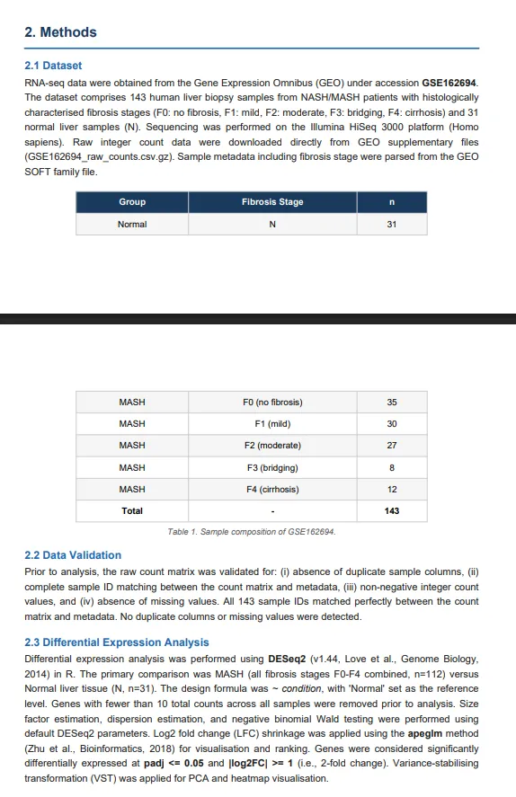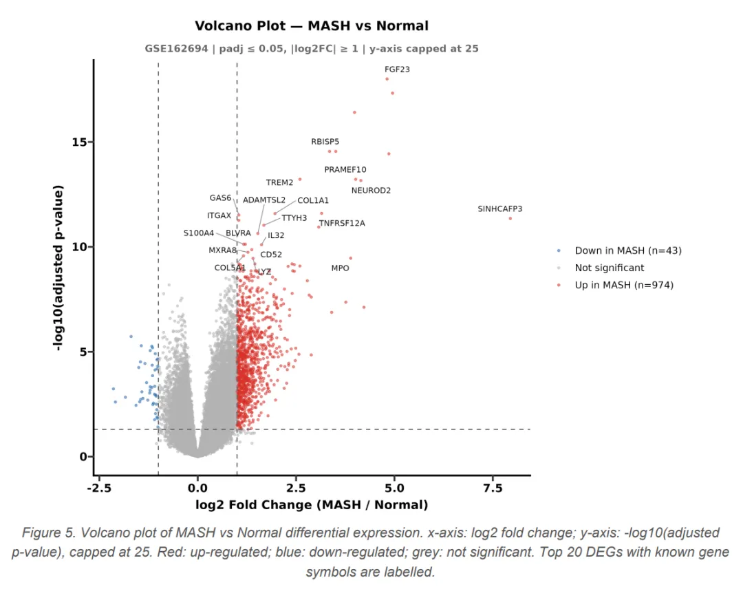 流程从 GEO 下载 GSE162694 数据集(143 例人类 MASH 肝活检 + 31 例正常肝组织的 RNA-seq 原始计数)开始,解析 SOFT 格式元数据提取纤维化分期(F0-F4 及 Normal),验证样本 ID 完全匹配后进入 R 环境。DESeq2 全流程走完——低表达基因过滤、构建 DESeqDataSet、负二项分布 Wald 检验、apeglm LFC 收缩,最终在 padj ≤ 0.05 且 |log2FC| ≥ 1 的阈值下识别出 1017 个显著 DEG(974 个上调、43 个下调)。