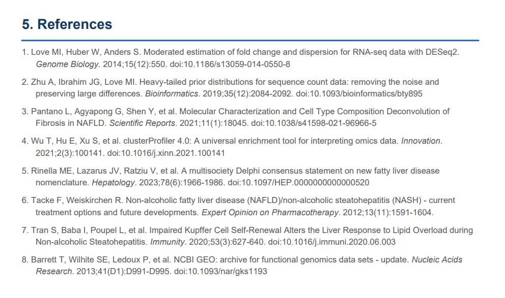 正文引用了 DESeq2、apeglm、clusterProfiler 的原始文献,样本构成以格式化表格呈现,所有图表以图注嵌入对应章节。这份报告的格式和内容完整度,已接近可以直接投稿的补充材料水准。