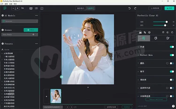 Perfectly Clear WorkBench 中文版是一款功能强大的摄影后期精细化处理软件,帮助摄影师修复摄影作品,使照片更加清晰,色彩更加动人,能够自动识别风景、人像照片,自动使用预设调色,支持一键批量出图