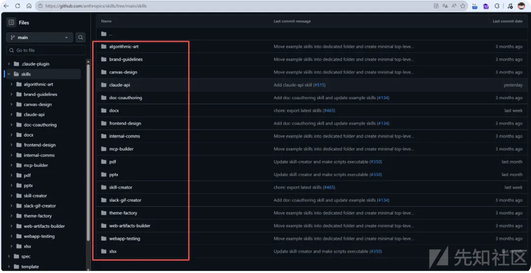 访问官方仓库,里面有一些常用的skill,可根据文件夹名字大概猜测出每个skill的功能
