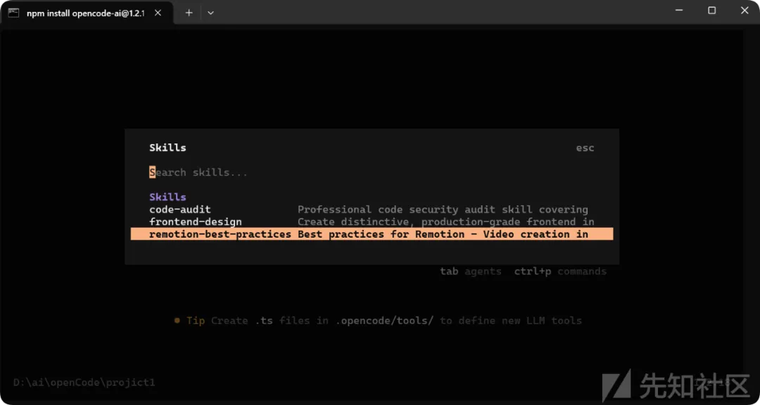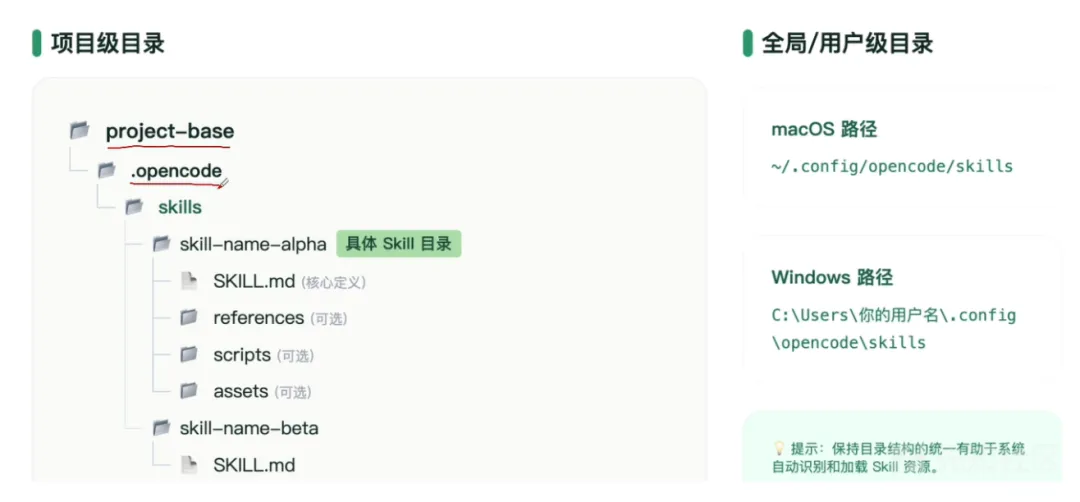 二者区别:放在全局目录下的skill,所有运行的opencode都可以进行使用,放在某个项目目录下的skill只有当前项目可以使用。根据对skill的不同需求来选择放置位置