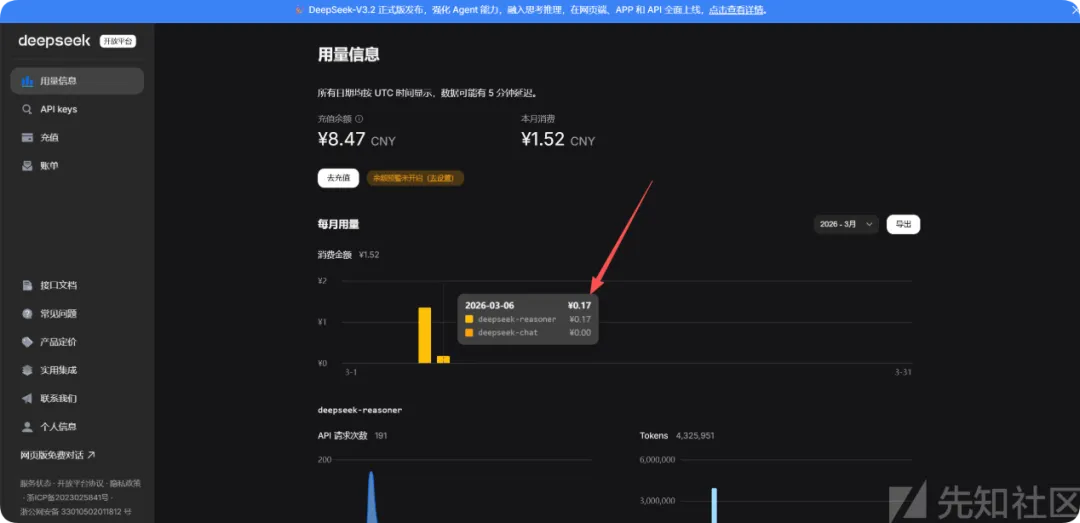 deepseek的token消耗还是比较便宜的,花费0.17元