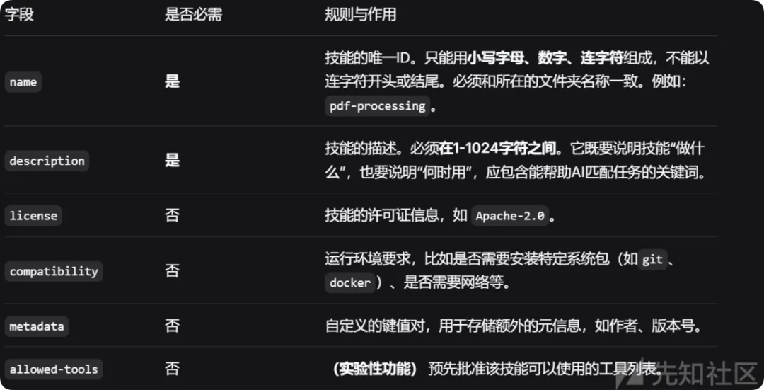 前置元数据是skill的身份信息,帮助AI快速识别和理解这个技能是做什么的。