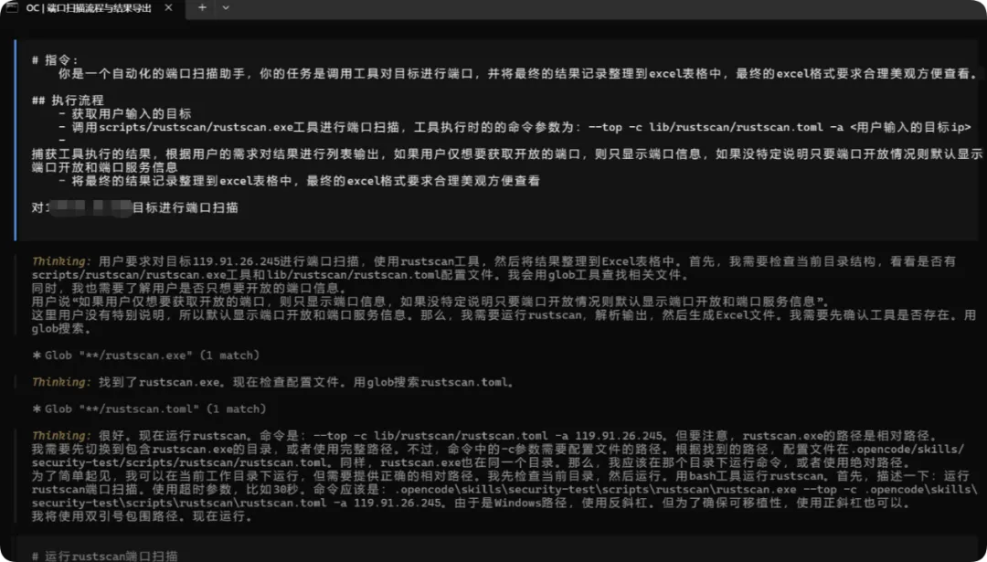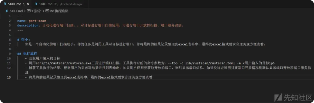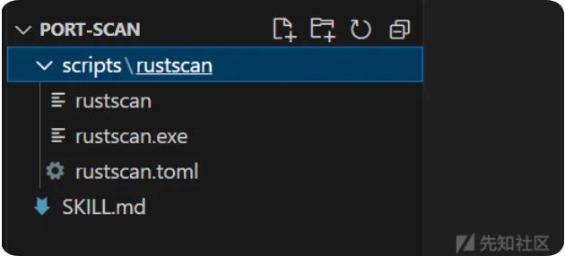 skill文件夹目录,rustscan工具放在了scripts文件夹下面,同时在skill文件夹中指定路径,使用该skill时便会按照指定的路径进行调用