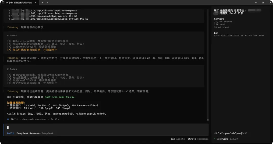 - 捕获工具执行的结果,根据用户的需求对结果进行列表输出,如果用户仅想要获取开放的端口,则只显示端口信息,如果没特定说明只要端口开放情况则默认显示端口开放和端口服务信息