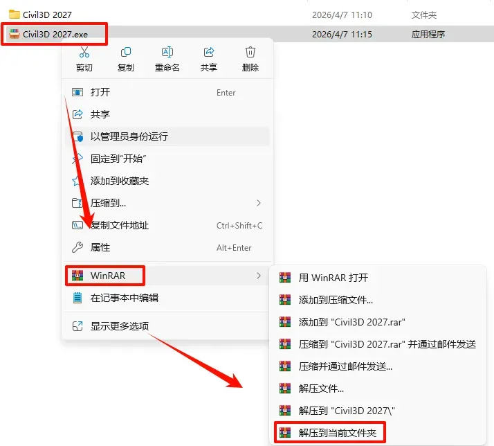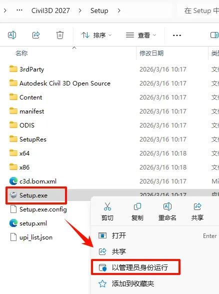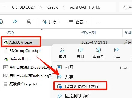 8.返回之前解压的“Civil3D 2027”文件夹,依次打开“Crack——AdskUAT_1.3.4.0”文件夹,选中“AdskUAT.exe”文件,鼠标右键选择“以管理员身份运行”