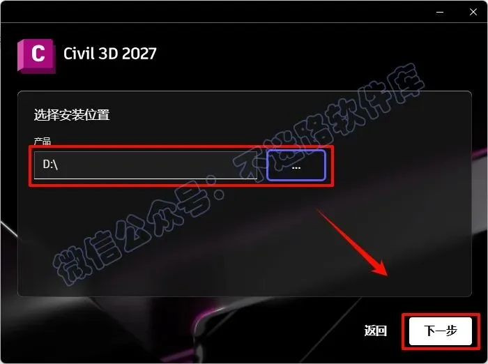 4.选择软件安装路径,建议和教程中的保持一致,本例安装在D盘(将路径地址中的首字符C改为D表示安装到D盘,安装路径不要出现中文),点击“下一步”