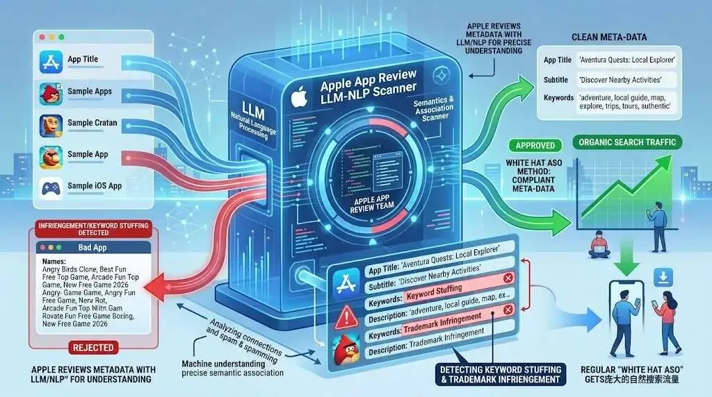 苹果审核团队目前已经全面引入了基于大语言模型(LLM)的自然语言处理(NLP)扫描技术。这套风控系统能够像人类一样精确理解词汇的语义关联度,任何生硬的关键词堆砌和侵权蹭词,在机器面前都会瞬间原形毕露。今天,我们将深度拆解 iOS 商店元数据的最新雷区,教你如何用正规的“白帽 ASO”打法,在合规的框架内截获庞大的自然搜索流量。