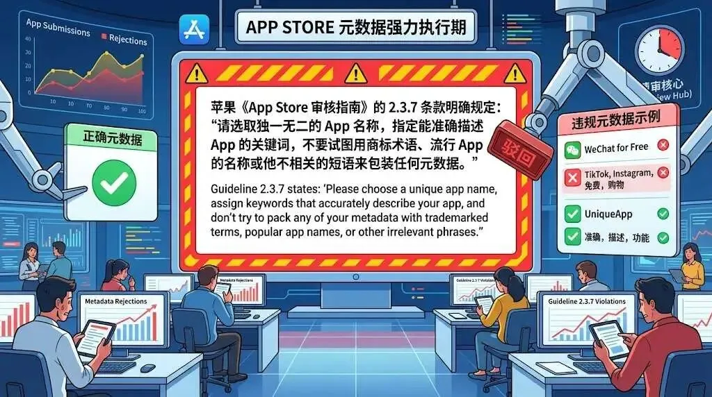 这种被称为“黑帽 ASO”的野蛮打法,在早期确实能吃到大量的蹭词红利。但在 2026 年的今天,如果你还敢在 App Store 的元数据(Metadata)里这么操作,等待你的绝不仅仅是一封温和的修改建议邮件,而是直接触发苹果严苛的 2.3.7 拒审条款,重犯者甚至会面临整个开发者账号被永久封停的灭顶之灾。