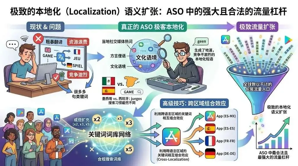 这是 ASO 中最合法且最强大的流量杠杆。很多开发者在做欧洲市场时,只是粗暴地用翻译软件把英文关键词翻译成法文或德文。这是极其严重的资源浪费。 真正的 ASO 极客深谙每个国家的文化语境。在西班牙语大盘中,墨西哥用户和西班牙本土用户搜索“游戏”的习惯用词截然不同。通过深入研究当地的社交媒体热词和方言俚语,将这些极其地道、且竞争不激烈的本地化短语填入对应的语言元数据后台中。 此外,苹果允许同一个应用配置多个语言版本,你可以利用跨语言区域的关键词相互组合效应(Cross-Localization),成倍扩充你的合规搜索词库,神不知鬼不觉地囊括全球数以千计的长尾流量入口。
