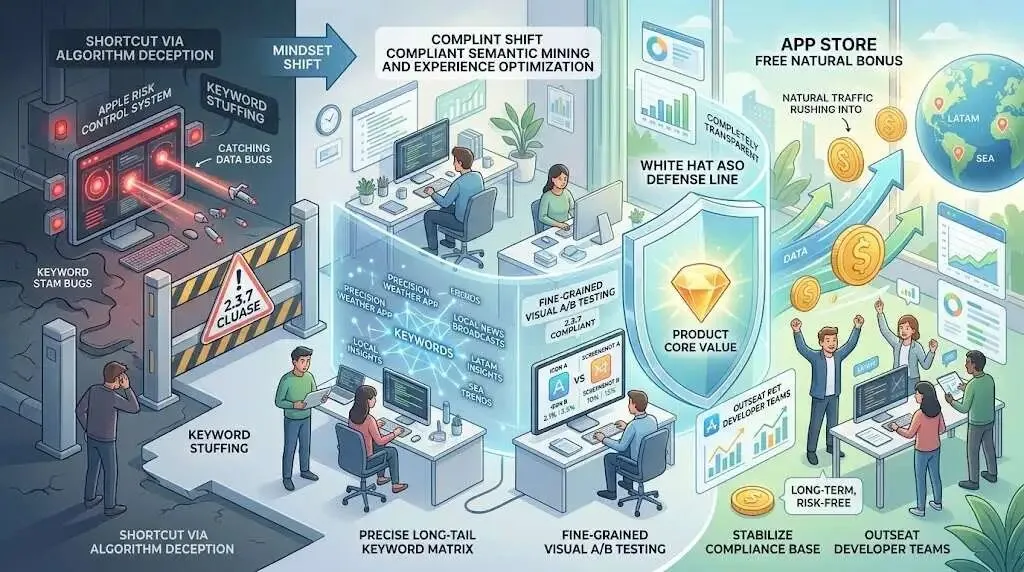 在苹果日益严苛的风控体系下,试图通过欺骗算法来获取流量的捷径已经被彻底阻断。2.3.7 条款的威慑力在于,它逼迫开发者回归产品的核心价值。出海团队必须完成思维的转变,从“违规蹭词”转向“合规的语义挖掘与体验优化”。利用精准的长尾词矩阵与精细入微的视觉 A/B 测试,构建起完全透明、经得起任何审查的白帽 ASO 防线。只有稳住合规的基本盘,你的产品才能在应用商店享受长线、无风险的免费自然红利。