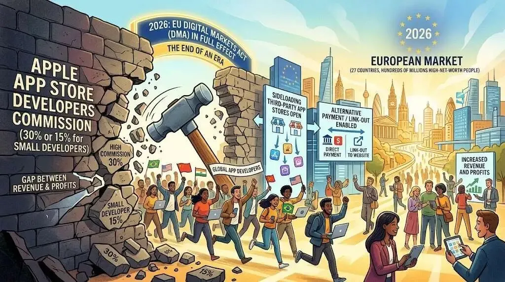 对于全球的出海开发者而言,苹果 App Store 高达 30%(或小型开发者 15%)的内购抽成,始终是一道横亘在营收与利润之间的巨大鸿沟。但进入 2026 年,这堵看似坚不可摧的高墙,终于在欧洲市场被彻底砸开了一个巨大的缺口。