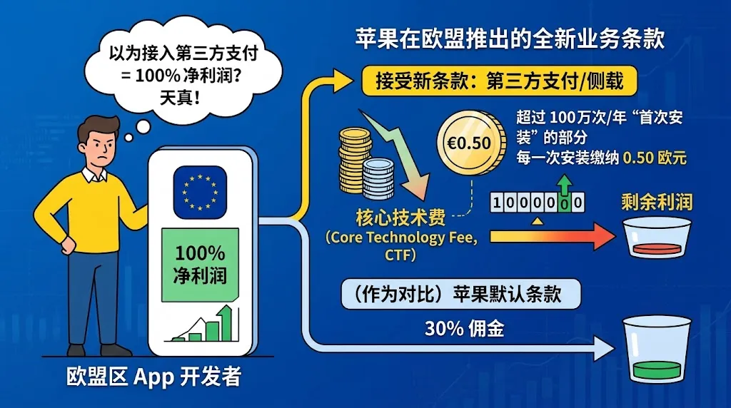 如果你以为接入第三方支付就等于 100% 净利润全拿,那就太天真了。为了弥补佣金损失,苹果在欧盟推出了全新的业务条款(New Business Terms),引入了 核心技术费 (Core Technology Fee, CTF)。