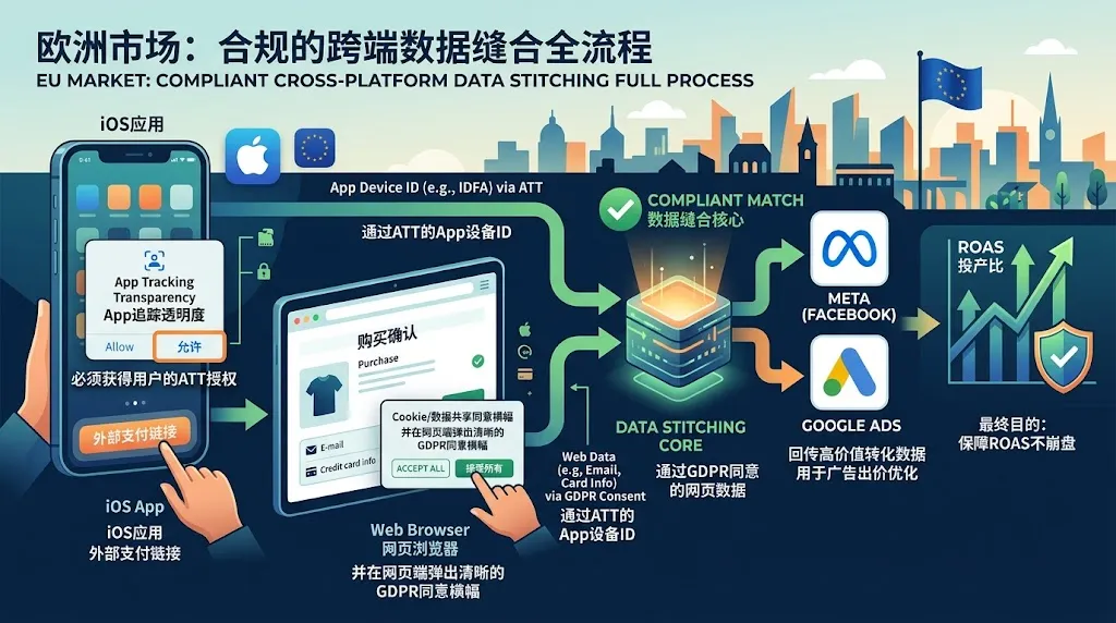 当用户通过外链跳出 App 并在网页端完成购买后,你需要将这笔高价值的转化数据回传给 Meta 或 Google 用于优化广告出价。此时,如果你在网页端收集了用户的邮箱、信用卡信息,并跨端与 App 端的设备 ID 进行匹配,必须确保在 App 端已经拿到了用户的 ATT 授权,并在网页端弹出了清晰的 Cookie/数据共享同意横幅。合规的数据缝合,是保障欧洲市场买量 ROAS 不崩盘的底线。