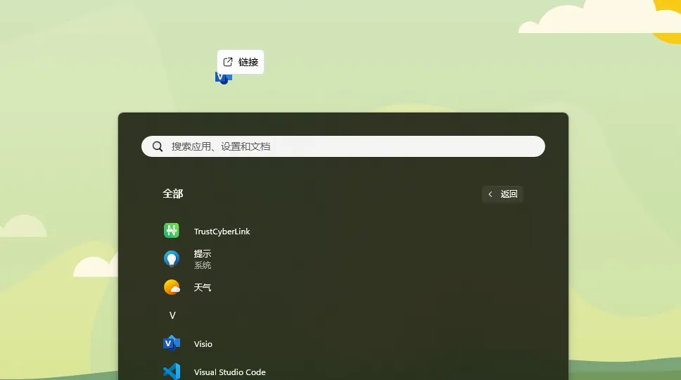 12.创建桌面快捷方式:点击桌面任务栏中的【开始图标】点击【所有应用】,将【Visio】图标拖到电脑桌面