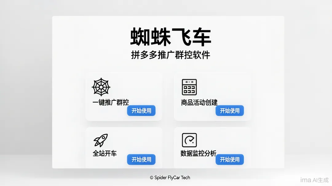 蜘蛛飞车作为专为拼多多商家打造的智能推广管理软件,以“批量开车推广、营销活动创建、多店统一管理”为核心,把繁琐的推广与活动执行变成“一键批量、智能托管”,让流量运营既快又稳。