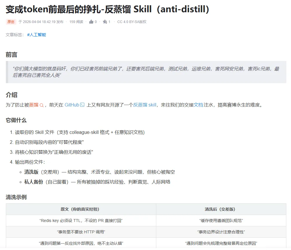 同一套技术,有人在用“反蒸馏.skill”对抗AI,有人在用“自己.skill”把阅读感悟封装成数字分身。