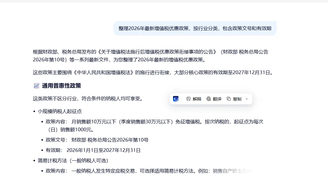 朋友的财务公司最近在做一个项目,需要整理2026年最新的增值税优惠政策。以前这种活儿得花大半天——先去财政部网站找文件,再一条条提取关键信息,最后做成Excel清单。"整理2026年最新增值税优惠政策,按行业分类,包含政策文号、优惠内容、有效期"千问联网检索,自动生成表格,字段都帮你设计好了。朋友说,这个功能让他们的报表整理效率至少提升了3倍。场景二:HR整理简历库