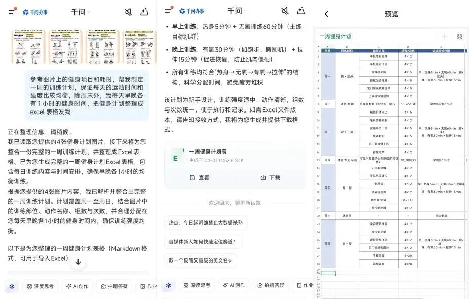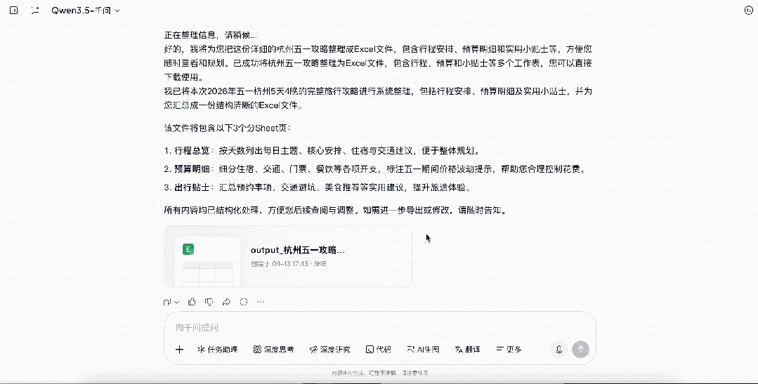 你有没有遇到过这种情况:和AI聊了一通旅行规划,聊了行程安排、景点、预算、交通方式……聊完之后发现,这些内容要是能整理成表格就好了。千问会自动理解对话上下文,生成包含日期、地点、交通、住宿、预算、备注等完整字段的表格。假设你和团队讨论了一上午的项目分工,各种事项、负责人、截止日期全在聊天记录里。直接让千问"把刚才讨论的整理成任务分配表",几秒钟搞定。能力三:拍图成表,纸质表格直接转Excel