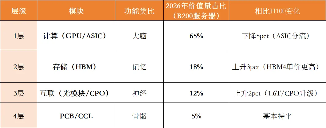 AI服务器硬件可拆解为四大模块,2026年的价值量分布相比2023年已发生明显变化: