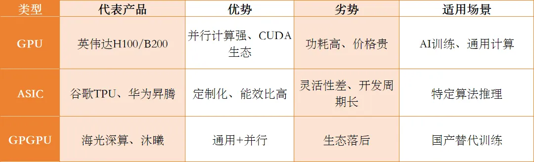 计算(GPU/ASIC):AI的“大脑”,负责模型训练和推理