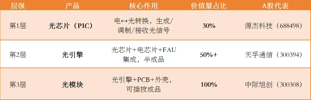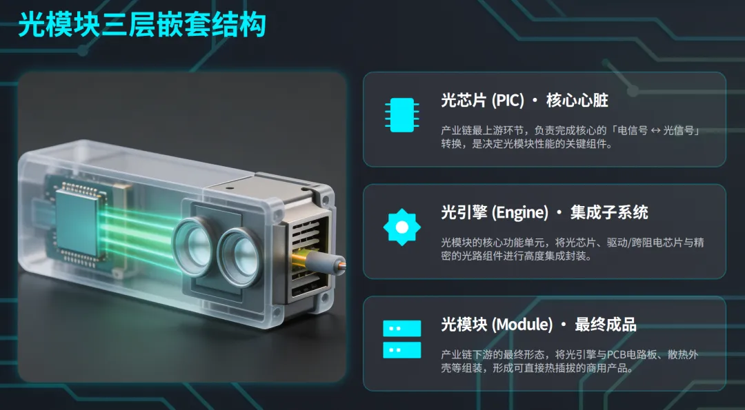 三层嵌套:光芯片(PIC)→ 光引擎 → 光模块