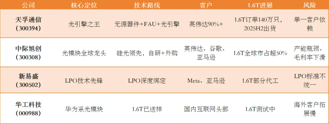 记住:三层嵌套(光芯片→光引擎→光模块),CPO是未来,天孚=英伟达90%+份额,旭创=1.6T市占超50%,新易盛 = LPO深度依赖,Meta/亚马逊大客户,技术组合 = 硅光 + LPO = 主流方向。