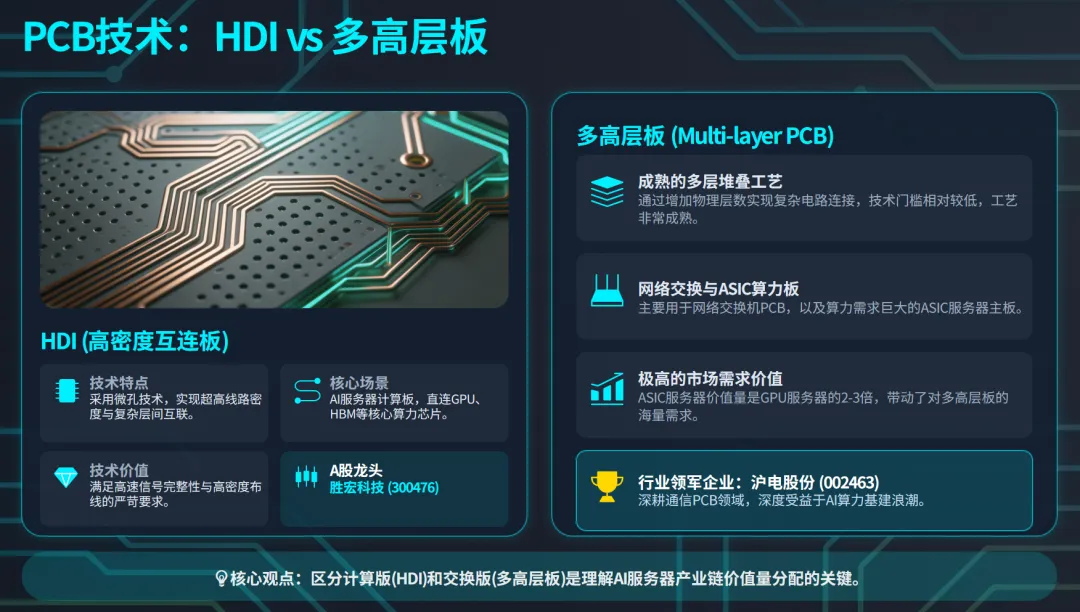 ASIC服务器只用多高层板(不用HDI),但每台ASIC服务器PCB价值量是GPU服务器的2-3倍。沪电股份在ASIC服务器PCB领域卡位最深。