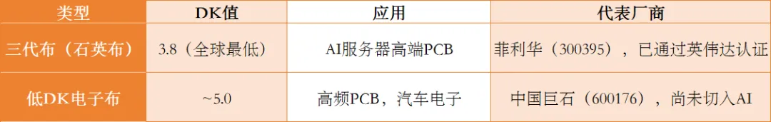 电子布(低DK高频布)是AI服务器PCB的高端材料,DK(介电常数)越低,信号损耗越小。