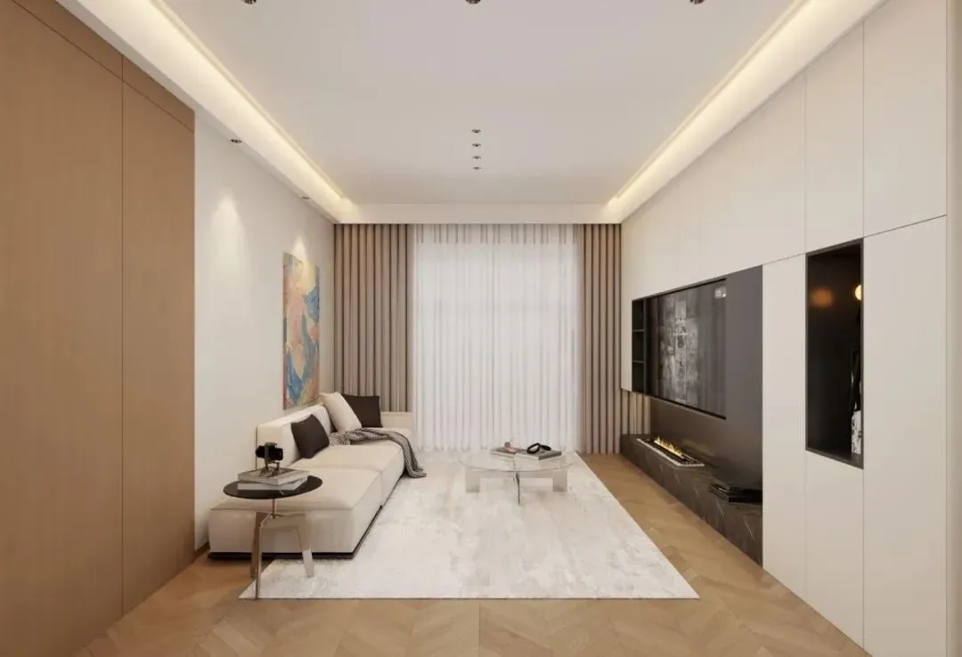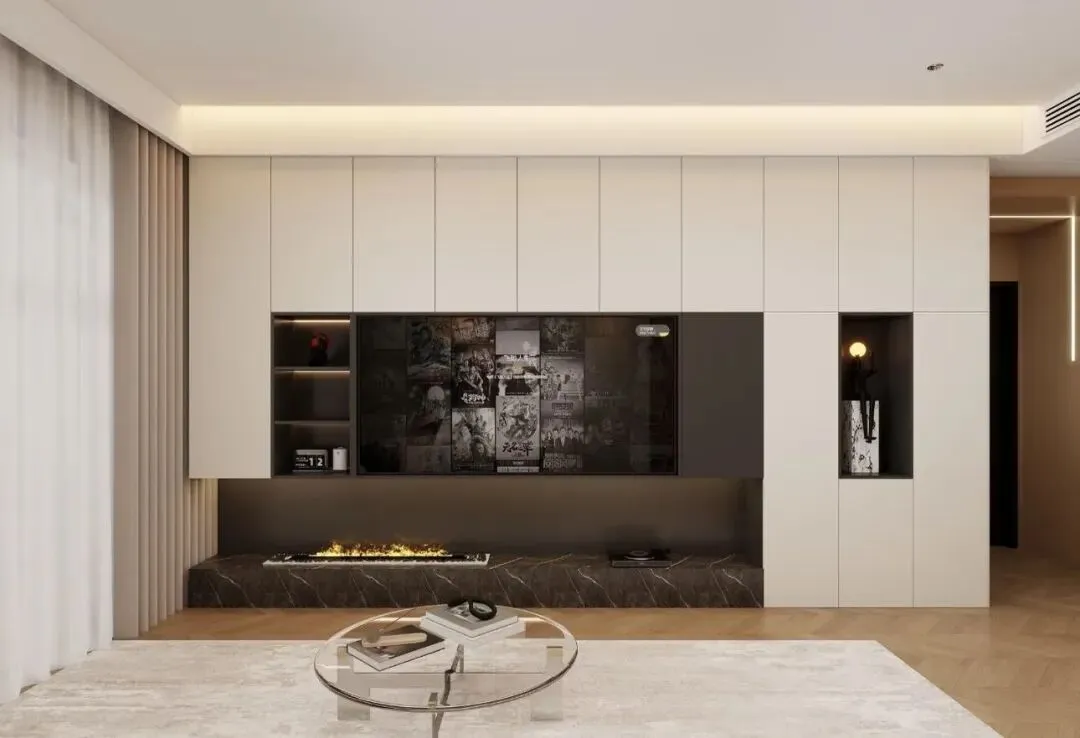 ▫️核心设计:客餐厅整墙收纳,柜门与墙面同色,隐形效果拉满;壁炉氛围灯+线性灯,低成本打造大宅质感