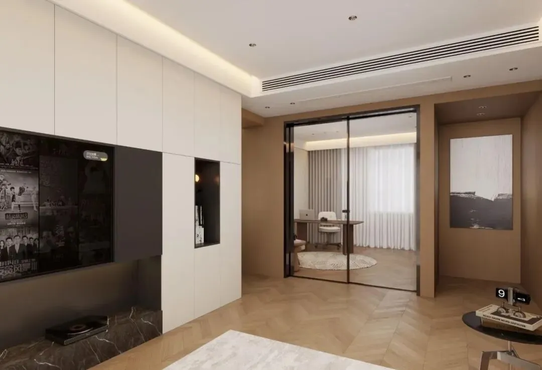 ▫️空间巧思:书房做玻璃推拉门,秒变开放/封闭模式,办公时不被打扰,聚会时扩容客厅空间