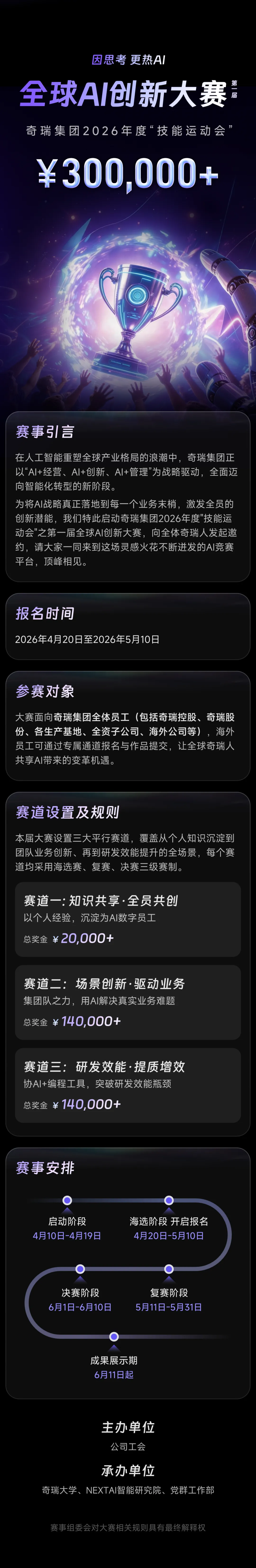 因思考,更热AI!奇瑞集团2026年度“技能运动会”之第一届全球AI创新大赛正式启动!