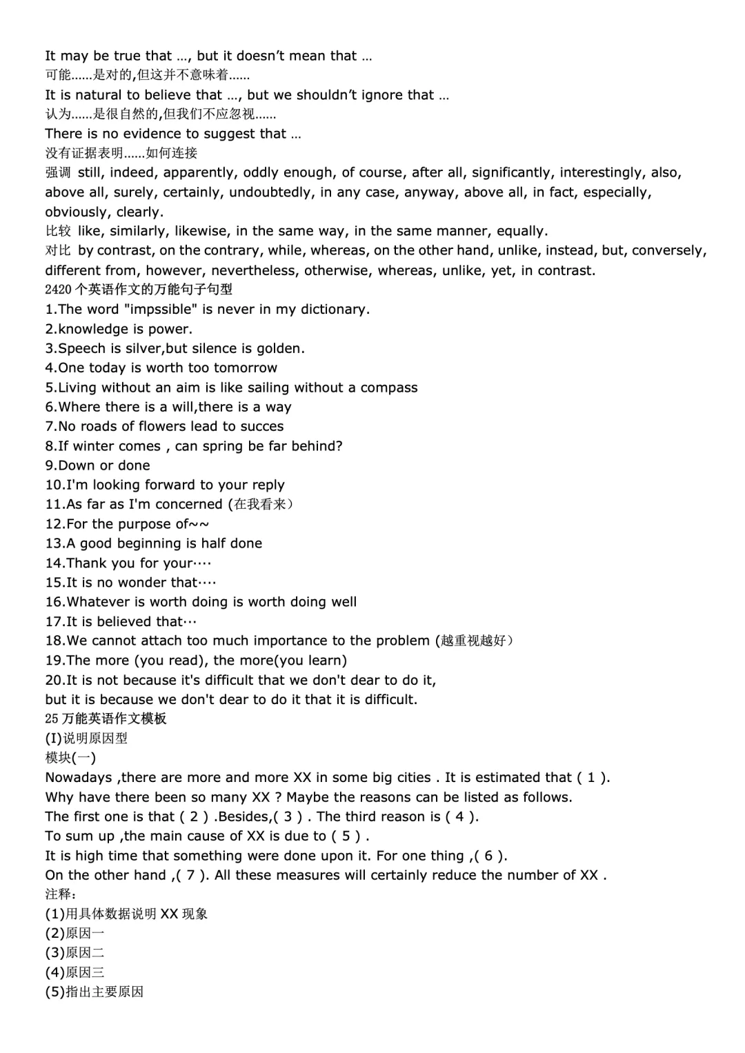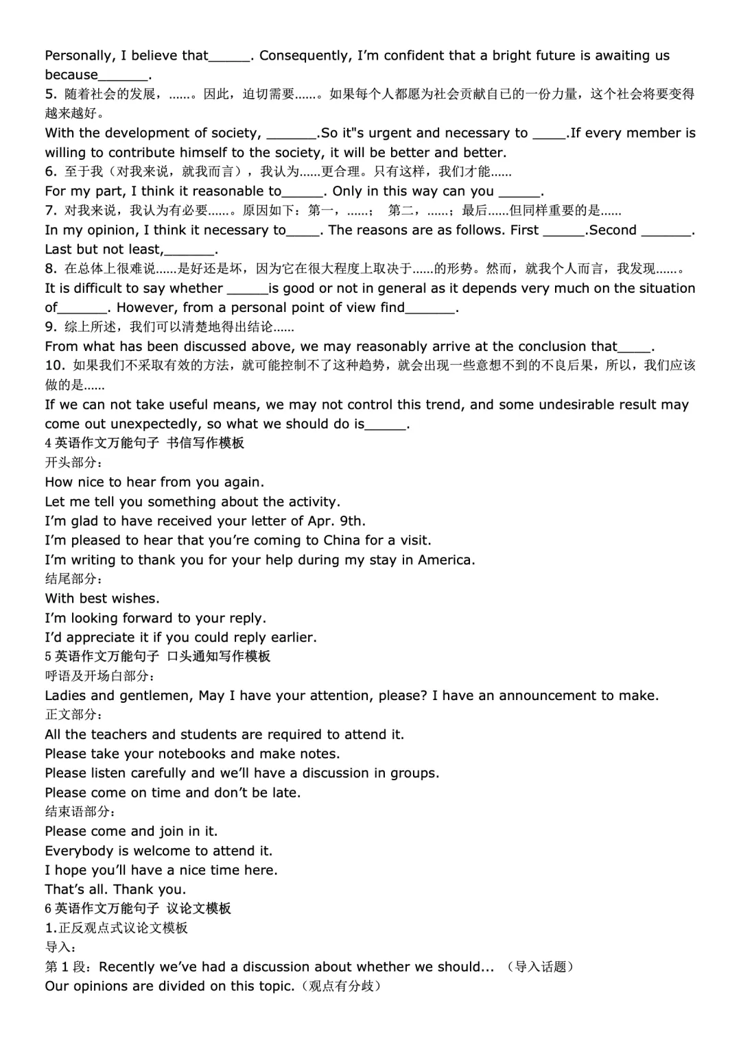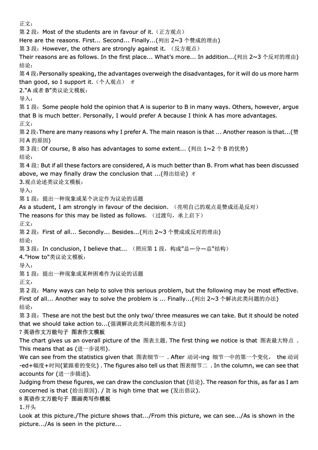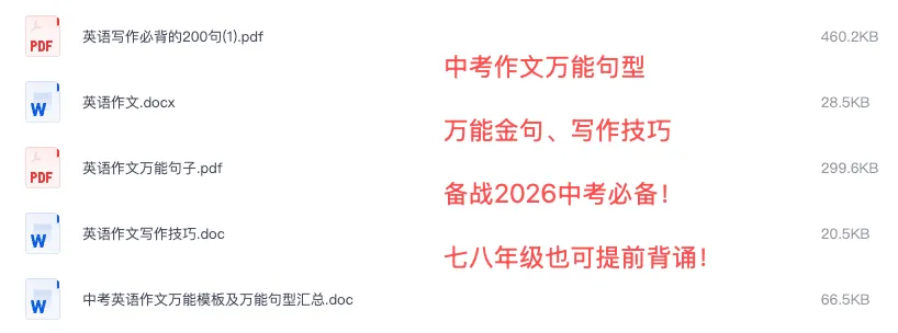 无论是应对中考常规题型,还是灵活应对图表、书信等特殊文体,无论是快速搭建作文框架,还是丰富句式提升文采,这套模板都能满足需求。适合中考学生日常积累、考前冲刺,也适合七八年级英语老师用于课堂教学、作文专项训练,助力高效备战2026中考!