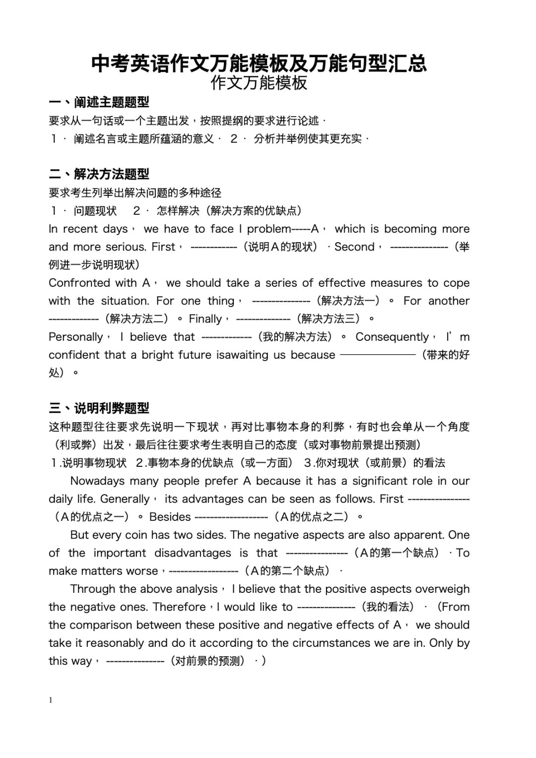 模板涵盖中考英语作文7大核心题型(阐述主题、解决方法、说明利弊、议论文、图表作文、现象说明文、说明原因),附加英语书信、口头通知等实用文体模板,配套10个万能句型模版+15个万能段首句,兼顾基础薄弱生和冲分学生的需求。所有模板均采用中考高频句式,结构清晰、逻辑连贯,无需复杂构思,直接填空就能套用,完美适配中考英语作文命题趋势,规避时态混乱、句式单一等常见扣分点。