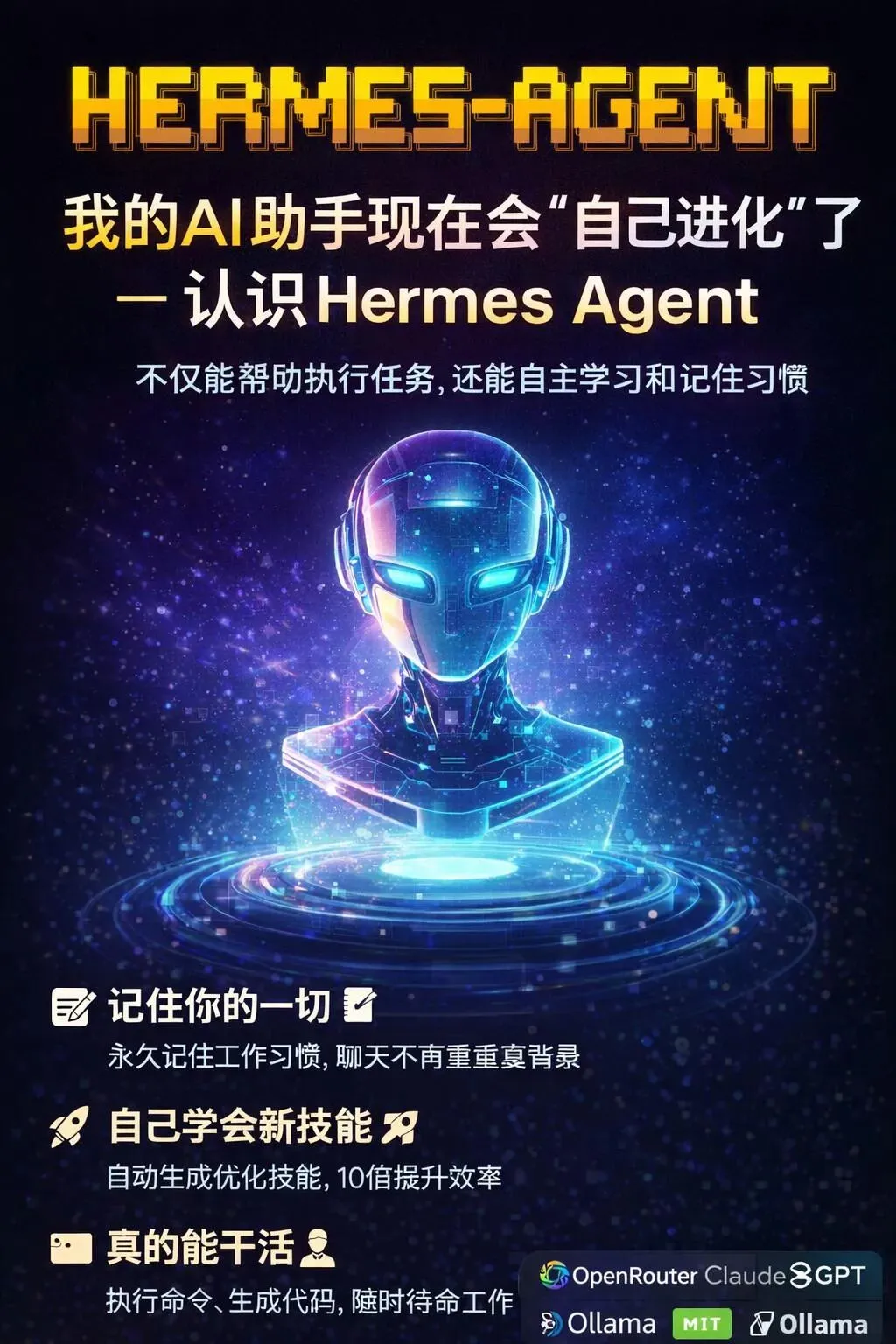Hermes 由 Nous Research 打造(就是做 Hermes 系列开源大模型的团队),核心是自进化智能体——不是执行工具,是会学习、会复盘、会积累经验的伙伴。