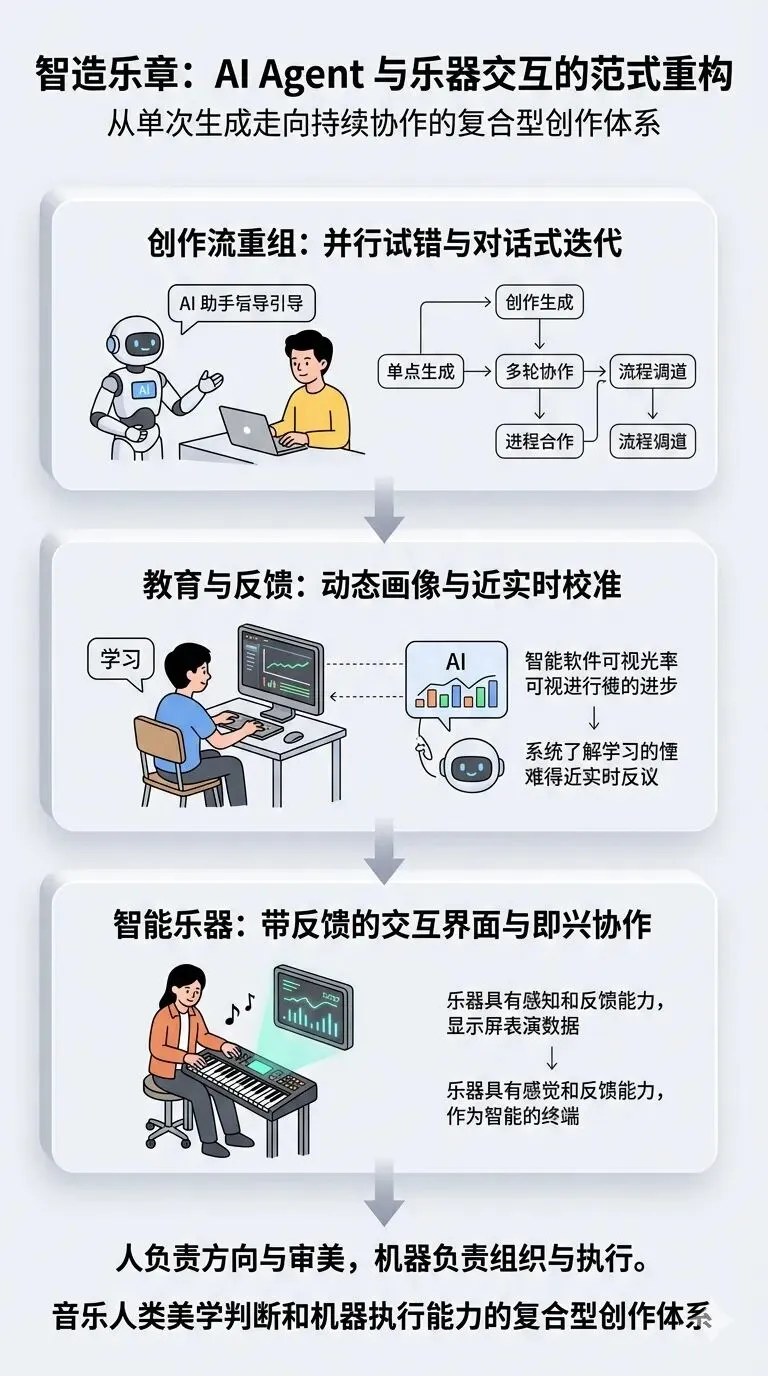 当人工智能从“会生成”走向“能理解、会规划、可执行”的 Agent 阶段,音乐产业正在经历一次深层次的结构性变化。这场变化不只发生在写歌软件或伴奏工具层面,更深入到创作流程、教学方法、演奏体验、版权治理与职业分工之中。乐器开始具备感知与反馈能力,学习系统开始理解不同学习者的节奏与难点,创作平台则从单点生成转向多轮协作与工作流调度。由此,音乐生产不再只是“输入提示词—得到成品”的机械过程,而逐渐演变为人类审美判断与机器执行能力共同构成的复合型创作体系。