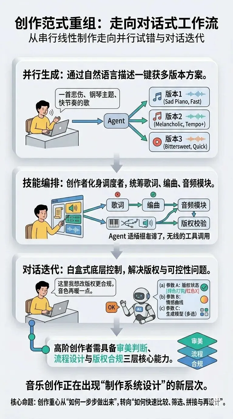 随着生成引擎、歌单生成器、歌词草拟、音频转录、风格迁移、虚拟歌手控制等能力被封装为可调用模块,创作开始呈现明显的“技能编排”特征。一个成熟的 Agent 工作流,不再要求创作者熟练掌握所有 DAW 细节,而是要求其清楚表达目标、安排流程顺序,并在多个方案中做出审美判断。某种程度上,音乐创作正在出现“制作系统设计”的新层次:真正重要的不只是写出哪一个音,而是如何组织一整套持续产出的机制。
