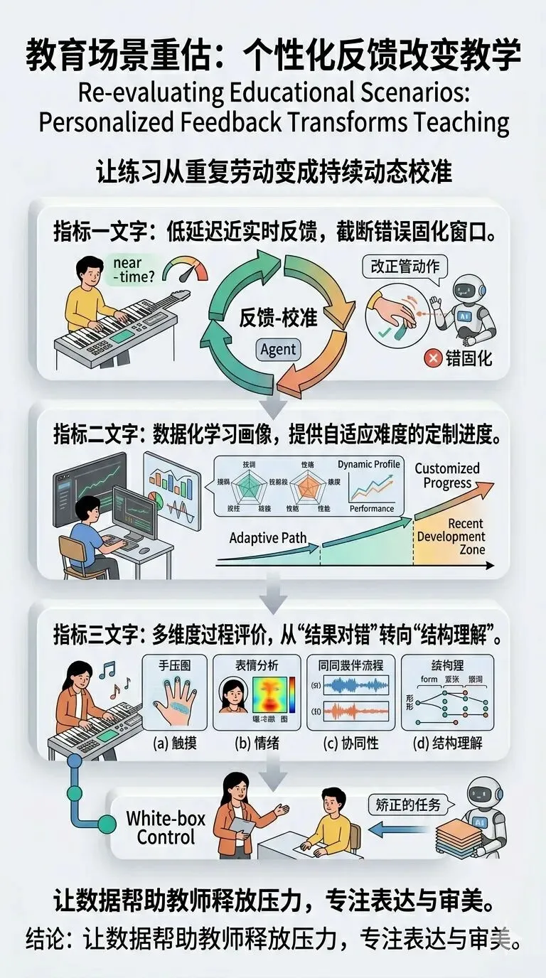 过去的音乐评价往往只看结果:音对不对、节奏准不准、是否完整弹完。多模态 Agent 则尝试把身体动作、触键方式、演奏稳定性、情绪表达甚至与伴奏的协同性纳入分析。这样一来,系统不仅能告诉学生哪里错了,还能提示错误可能来自手型、呼吸、节拍感或结构理解不足。评价的重点,也从简单的正确率,逐步转向对学习过程和理解层次的刻画。